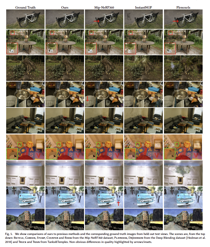 저자는 이러한 두 관점에서 장점을 결합한 기법을 제안하고자 합니다. 이는 3D Gaussian 표현을 이용하여 SOTA 수준의 시각적 품질, 훈련 시간을 보이며, tile-based splatting 기법을 통해 실시간 렌더링을 보입니다. 또한, 1080p 해상도에서도 SOTA를 보입니다.