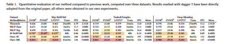 • An optimization method of 3D Gaussian properties, inter- leaved with adaptive density control that creates high-quality representations for captured scenes.