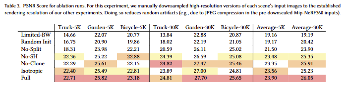 split이 없으면 큰 가우스들을 억제하지 못해 배경이 흐릿해지며, clone을 제거하면 구성되지 못한 영역에 대해 디테일한 표현력이 떨어지는 것을 보임