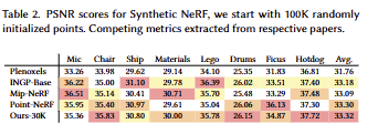 + 기존 NeRF가 아닌 point-based 기법들은 Muti-View Stereo (MVS)를 요구하는 반면에 저자는 초기 위치에 대해 랜덤 초기화를 적용했을 때도, NeRF-synthetic datasets에서 높은 퀄리티를 보여줌.