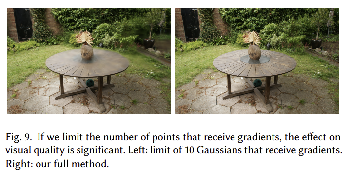 저자는 이러한 특징을 이용하여 threshold ?pos (저자는 0.0002 사용)을 임계값으로 사용하여 view-space gradient를 가진 가우시안을 이용합니다. 전반적인 흐름은 fig 4에서 확인 가능합니다.