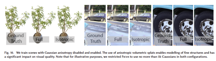 두 factor의 독립적인 최적화를 위해 스케일링을 위한 3D vector s와 회전을 나타내는 quaternion ?로 별도로 저장합니다. 이를 통해 효율적인 anisotropic covariance 표현이 가능해집니다. 정성적인 결과는 fig 3에서 확인 가능합니다.