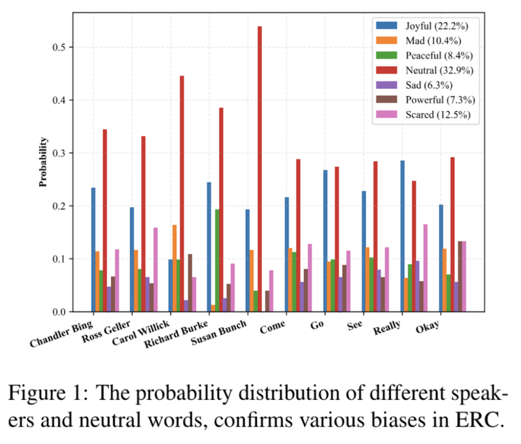 또한 label bias외에도 speaker, neutral word bias 또한 특정 단어와 특정 emotion category에 강한 연관성을 보이는 데이터로 학습된 모델에서 발생하는데요. 에를 들어, Figure 1에 표시된 것처럼 Richard Burke가 ‘mad’ 가 아닌 ‘joyful’, ‘neutral’, ‘peaceful’과 같은 감정과 연관될 가능성이 높습니다. 또한 neutral word도 emotion distribution에서 이러한 bias를 보입니다. 결과적으로 이러한 bias 때문에 모델은 text 고유의 정보를 이용하여서 감정을 분류하는 것이 아닌 편향된 통계 정보만을 기반으로 특정 category에 unfair하게 할당하려는 경향을 가지게 됩니다.
