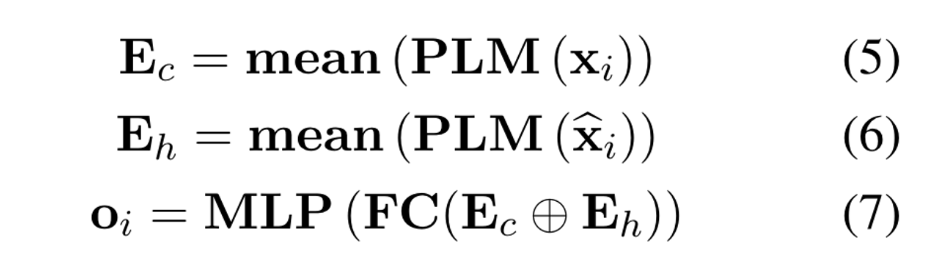 여기서 $o_i$는 prediction emotion을 의미합니다. $E_{c/h}$는 PLM을 통해 생성된 $u_i$와 context의 representation을 의미합니다. ⊕는 concat operation을 의미합니다.