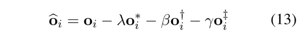 TFD의 마지막 단계입니다. bias된 학습된 모델에서 예측 logits $o_i$의 debias는 간단하게 element-wise subtraction 연산으로 구할 수 있습니다. 위에서 구한 logits들을 이용하여 최종적으로 아래와 같이 구할 수 있습니다.