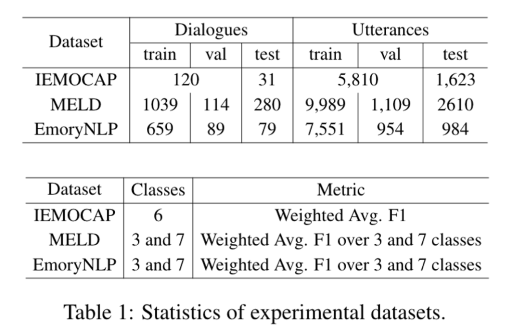 본 논문에서는 데이터셋으로 IEMOCAP, MELD, EmoryNLP를 사용하였는데요. ERC 중에서 NLP 논문을 계속 팔로업을 해보니 확실히 이 데이터셋 3개가 가장 많이 언급이 되는 것 같습니다. MELD와 EmoryNLP에 특징이 있다면 두 데이터셋 모두 드라마 프렌즈를 이용하여 만든 데이터셋이라는 것입니다. 두 데이터셋 모두 프렌즈를 이용했고 감정 수도 같으니 같은 데이터셋 아니지 생각할 수 있는데, 감정 수는 같지만 구성된 감정이 달라 같은 소스로만 구성된 데이터셋은 아님을 말씀드립니다.