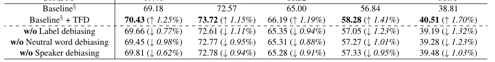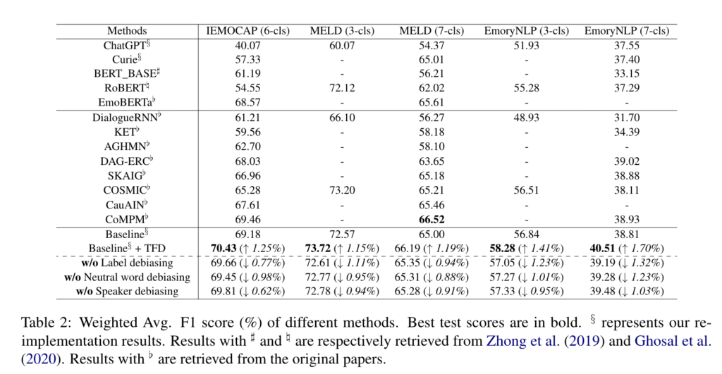 또한, ‘w/o Neutral word debiasing’, ‘w/o speaker debiasing’ 부분을 통해 화자와 neutral word를 debiasing할 시에 성능이 개선됨을 확인할 수 있습니다. 특히 화자와 neutral word debiasing을 EmoryNLP에 적용했을 시에 모델 성능이 크게 변화한 것을 확인할 수 있습니다. 그런데, Table 2에서 볼 수 있지만 화자를 debiasing 했을 때 IEMCOAP의 성능이 다른 데이터셋에 비해서 크게 변화하지 않음을 볼 수 있습니다. 이는 IEMOCAP 데이터셋이 각 화자가 뚜렷한 성격 특성과 감정적 성향을 가지고 있기 때문이라 말할 수 있는데요. IEMOCAP은 즉흥 연기를 통해서 데이터셋을 구성하였는데 이러한 즉흥적 표현은 캐릭터 이미지 형성에 우선순위를 두지 않기 때문에 특정 감정 표현에 대한 성향이 자연스럽게 줄어듭니다. 이 때문에 화자를 debiasing 했을 때 다른 데이터셋에 비해서 큰 차이가 발생하지 않은 것입니다. neutral word debiasing의 경우, 전반적으로 대화에 neutral word가 널리 사용되기 때문에 다양한 데이터셋에서 비교적 일괄된 개선 효과를 보여주는 것을 확인할 수 있습니다.