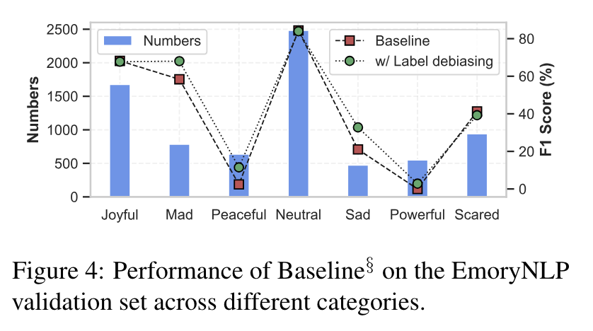 Figure 4를 보면 EmoryNLP의 불균형한 데이터로 인해서 baseline이 소수 class에 속하는 발화에 대해서 성능이 저하된 것을 볼 수 있습니다. 또한, 초록색 동그라미에 경우 label debiasing을 적용했을 때의 성능을 나타낸 것인데 소수 class인 ‘peaceful’, ‘sad’에 대해서 잘 워킹하는 것을 볼 수 있습니다. Figure 4 뿐만 아니라 ablation study의 ‘w/o label debiasing’을 보면 제일 마지막 열을 보시면 39.19에서 40.51로 debiasing을 했을 때 성능이 증가하는 것을 볼 수있는데 Figure 4와 ablation study 결과를 통해 label debiasing이 성능 향상에 기여함을 확인할 수 있습니다.