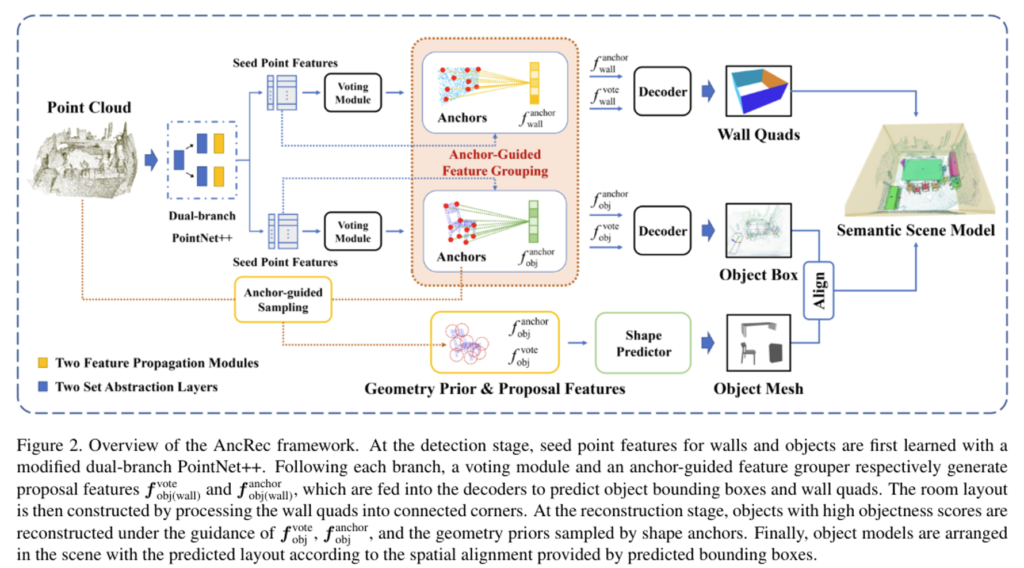 간단한 파이프라인 먼저 살펴보도록 하겠습니다. Fig.2가 논문에서 제안한 AncRec의 전체적인 프레임워크로 semantic scene reconstruction을 수행하게 됩니다. 먼저 검출 단계에서 포인트 feature을 그룹화 하기 위해 두 개의 브랜치가 존재하는데, 이 두 브랜치에서 물체와 전체 scene을 감싸는 벽에 대한 localization을 수행합니다. 그 다음 물체의 shape anchor을 활용해서 물체의 mesh를 예측하기 위한 instance geometry prior 샘플링을 수행합니다. 마지막으로 찾은 바운딩 박스와 pose에 맞추어 구성한 room 레이아웃에 물체 mesh를 배치하여 semantic scene 모델을 reconstruction하는 것이 전체적인 동작 흐름 입니다.