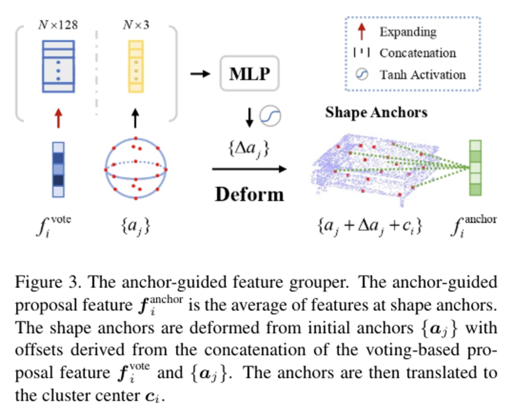 우선 voting으로 주어진 proposal feature f^{vote}_i \in \mathbb{R}^{128}이 주어지면 Grouper는 i번째 물체 후보 (proposal을 의미)의 shape을 나타내는 shape anchor을 생성합니다. 구체적으로 얘기해보면, 기본적으로 이런 grouping에서 사용하는 게 ball query라고 얘기를 했었습니다. 그 때 사용하는 단위 ball의 표면에서 균일하지만, 랜덤하게 N개의 초기 앵커 A = \{a_j \in \mathbb{R}^3 | j = 1, . . ., N\}를 선택합니다. 이 초기 앵커를 deformation layer를 통해 초기 앵커를 i번째 물체 후보의 표면으로 이동 및 변환하는데, 이는 식(1)과 같이 정의할 수 있습니다.