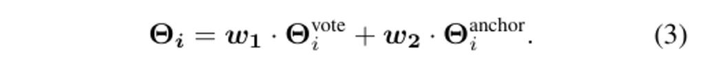 이제 두 개의 디코더를 사용해서 i번째 물체 후보에 대해 f^{vote}_i로 물체 클래스를, f^{anchor}_i로 바운딩 박스 파라미터를 예측합니다. 이렇게 설계한 이유는 voting 기반 proposal인 f^{vote}_i가 여러 context 정보를 고려해서 선정된 반면, f^{anchor}_i는 좀 더 물체 자체에 초점을 맞추었기 때문이라고 합니다. 디코더를 거쳐서 추정된 각 파라미터들은 \Theta^{vote}_i와 \Theta^{anchor}_i로 표시되며, 식(3)과 같이 learnable한 가중치로 평균내어 최종 i번째 물체에 대한 예측 파라미터 \Theta_i를 얻을 수 있습니다.