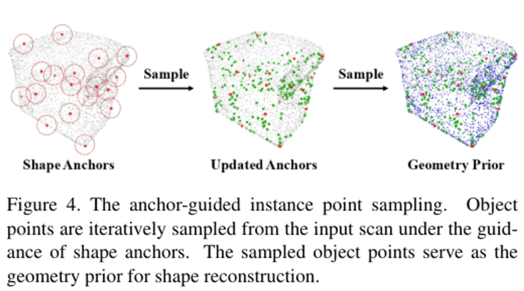 입력 스캔의 instance 포인트는 reconstruction을 위한 기하학적 prior로 사용됩니다. 이전 연구에서는 intro에서 이야기하였듯 instance 포인트 샘플링을 위해 segmentation을 수행했어야 했는데요, 이는 한계점 (2)로 지적한 것처럼 search space에서 물체가 아닌 포인트, 즉 노이즈가 존재하기 때문에 정확한 instance segmentation가 어려워집니다. 그래서 본 논문에서는 shape anchor을 활용해서 노이즈 간섭이 거의 없는 search space를 구성함으로써 물체 포인트 위치를 파악할 수 있도록 하였습니다.