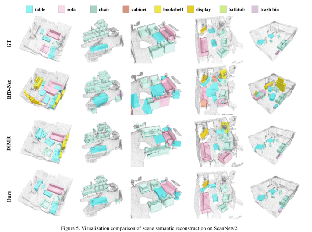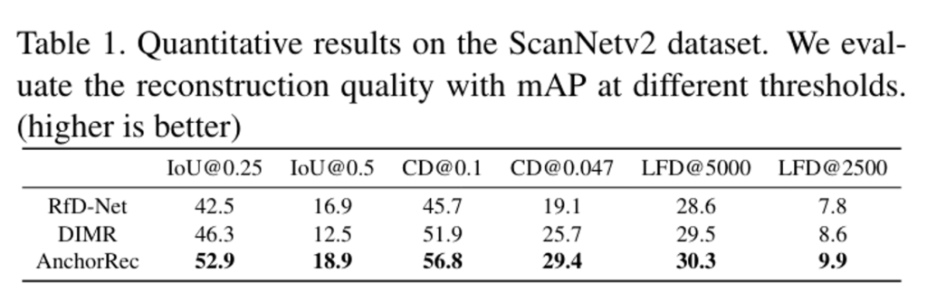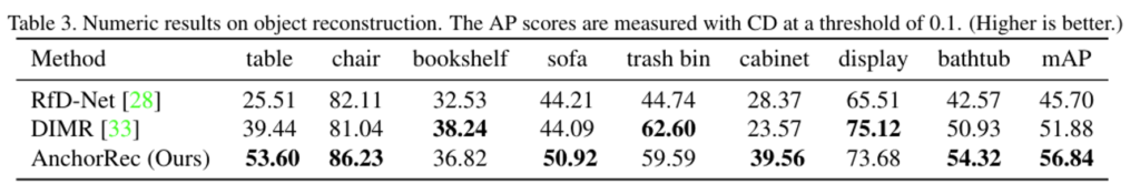 비교할 방법론으로는 RfD-Net과 DIMR을 선택하였는데, RfD-Net은 VoteNet의 voting 모듈로 생성한 proposal에서 segmentation을 통해 instance 포인트로 물체의 shape을 예측합니다. 반면 DIMR은 복잡한 instance segmentation 백본을 타고나온 instance 포인트로 물체 모델을 형성하게 되죠.