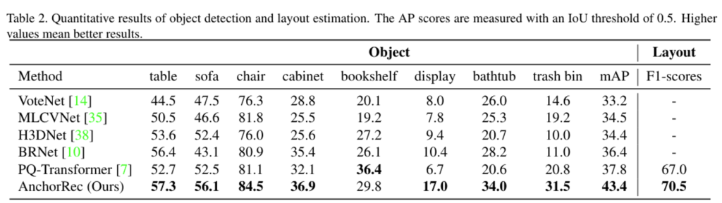 8개의 클래스 물체 검출과 레이아웃 추정에 대해서 최신 방법론들과 비교하고 있습니다. Tab.2를 보면 bookshelf를 제외한 타 클래스에서 모두 성능 향상을 이루었으며 특히 디스플레이, 욕조, 그리고 쓰레기통은 큰 폭을 가지고 성능이 개선된 것을 확인할 수 있습니다. 이러한 결과에 대해 저자는 이전에 고정된 범주의 그룹화가 아닌 AncRec를 통해 flexible한 그룹화를 수행하면서 다양한 크기와 불규칙한 shape을 가진 물체를 감지하는데 효과적으로 작동할 수 있었다고 분석하고 있습니다.
