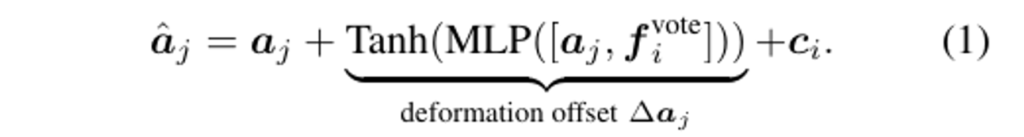 deformation layer는 MLP와 활성화 함수를 타고 나온 offset \vartriangle a_j만큼 a_j를 이동 시키고 voting 모듈이 클러스터링 해놓은 중심 후보 c_i에 변형된 앵커를 배치하는 것 입니다.
