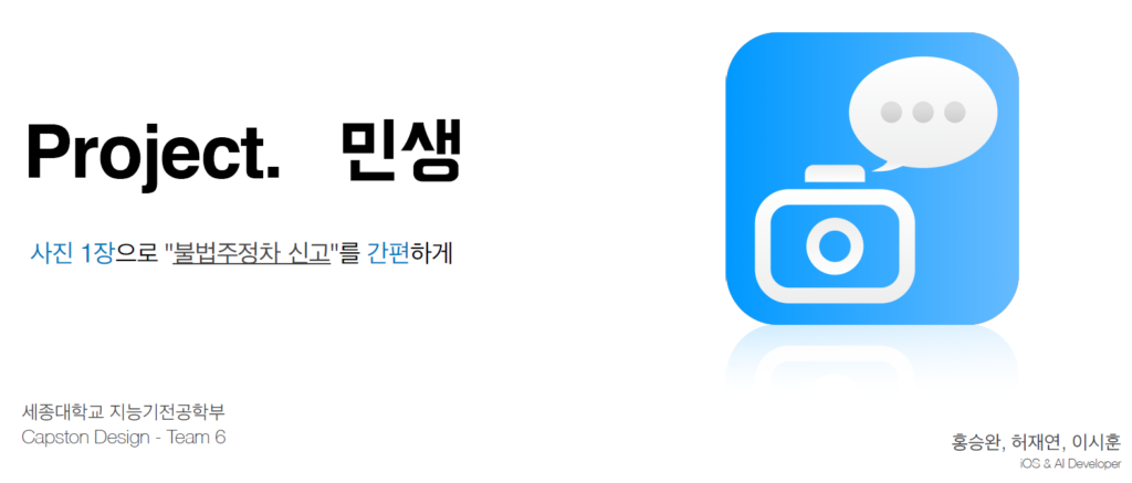 한 학기 동안 캡스톤에 정말 많은 시간을 쏟아부었습니다. 2023년 말 3인으로 팀을 구성하고 2024년 초부터 회의를 시작하였습니다. 원래는 빠르게 주제 잡고 구현까지 마무리해서 좀 여유있게 가는것이 목표였는데, 기획이 계속 엎어져서 마지막에는 시간에 많이 쫓겼습니다. 항상 느끼는건데, 기획이 가장 어려운 것 같습니다. 많은 논의 끝에 저희가 맨 처음 잡은 주제는 ‘커스텀 단어장 만들기’였습니다. 수능/편입/토익 등 영어를 공부하는 학생들이 공부하다 만난 단어를 암기하기 위해 따로 정리하는 과정을 단축시켜주고, 나만의 단어장을 만들어 편집할 수 있게 하는 것이었습니다. OCR 및 NLP를 함께 사용하는 어플이었는데, 백엔드 및 NLP쪽 기술 이슈로 기획이 무산되었습니다. 꽤 좋은 기획이었는데, 다시 생각해도 아쉽습니다. 두 번째 기획은 영양성분표를 이용하여 알레르기 환자나 비건이 먹을 수 있는 음식인지 안내해주는 어플을 구상했습니다. 하지만 관련 자료조사를 하다 보니 상품의 영양성분표만으로는 알레르기를 유발하거나 비건이 피해야하는 정확한 모든 첨가물/원료들을 알 수 없다는것을 깨닫고 무산되었습니다. 중간고사 기간이 되어서야 세 번째 기획이 나왔고, 최종적으로는 해당 기획으로 결과물을 만들었습니다. 해당 기획에서는 불법 주정차 신고를 매우 간편하게 만들어주는 어플 제작을 목표로 하였습니다. 프로젝트 이름은 민생(민원생성기)로 결정했습니다.