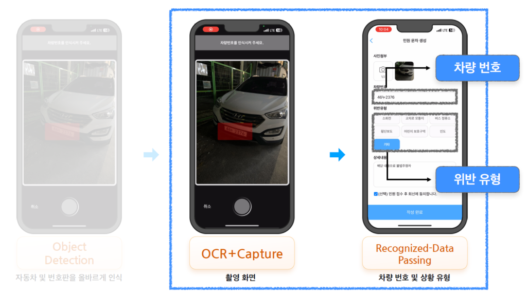 조사해보니 불법 주정차로 인한 교통 사고 및 2차 피해가 꽤 심각한 사회문제이지만, 우리나라에서 현실적인 억제 방법이 부족하다는것을 알게 되었습니다. 이에 저희는 간단한 신고를 통해 불법 주장차 신고를 활성화하여 빈도를 낮추는것을 목표로 했습니다. 주제와 개요의 스토리라인이 잘 나와서 다행히 교수님이 주제가 정말 좋다고 칭찬해주셨습니다. AI는 OCR(CRAFT), Detection(Yolo), Image Classification(Efficientnet)을 사용하였고 사진 한 장 촬영을 통해 해당 사진과 휴대폰에서 차량 번호, 위반 유형, 주소 및 위치, 신고자 정보, 신고 시간 등 신고에 필요한 모든 정보를 한번에 뽑아낼 수 있게 하였습니다.
