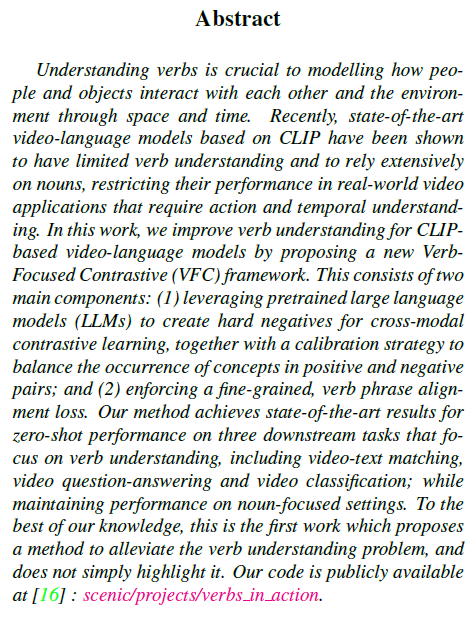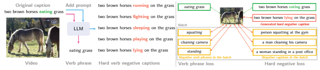 본 논문의 목적은 Vision-language 모델에게 비디오 속 동사의 구별력을 강조되어있는 효과적인 feature를 얻고자 하는 것입니다. 이를 위해 기본적으로는 contrastive learning을 수행하며 본 방법론은 기존의 contrastive learning 프레임워크를 크게 수정하지 않으면서 LLM을 활용해 동사의 표현력을 학습하는 방법론이라고 생각하시면 됩니다.