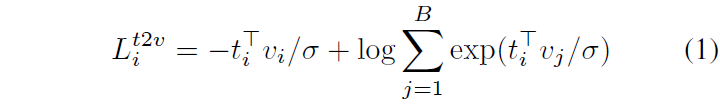 우선 N개의 비디오-텍스트 쌍 {(V_{i}, T_{i})}{i \in{} N}가 있을 때 비디오 인코더 f와 텍스트 인코더 g를 통해 각각의 feature v{i} = f(V_{i}), t_{i} = g(T_{i})를 추출합니다. 여기까지 진행했을 때 가장 기본적인 contrastive learning은 L^{t2v} + L^{v2t}를 최적화하는 것이고, L_{i}^{t2v}는 아래 수식 (1)과 같습니다.