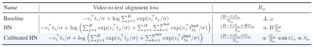 따라서 저자가 제안하는 Calibration 방법론은 세번째 수식인 Calibrated HN과 같습니다. 수식이 어려워보이지만 단순히 G_{\omega{}} \approx{} G_{\omega{}}가 될 수 있도록 배치 내 자기 자신을 제외한 나머지 샘플들로 생성한 HN은 사용하지 않습니다. 수식을 보시면 현재 보고 있는 자신의 캡션만으로 생성한 HN들만이 추가적으로 사용되고 있는 상황입니다. 이러한 방식을 통해 안정적이고 효과적인 학습을 수행했다고 합니다.