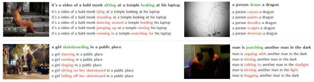 학습 중엔 하나의 캡션에 대해 ‘In this task, you are given an input sentence. Your job is to tell me 10 output sentences with a different meaning by only changing the action verbs’라는 프롬프트를 주어 negative 캡션들을 추출합니다. 아래 그림 2에서 LLM이 생성한 negative 캡션에 대한 예시를 확인할 수 있습니다.