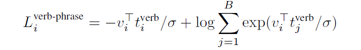 이후 추출한 동사구로 아래와 같은 loss를 적용해 동사 구 끼리의 학습을 진행해줍니다. 여기선 별도로 hard negative를 추출하진 않고, 단순히 배치 내 동사 구 끼리 학습하는 것입니다.