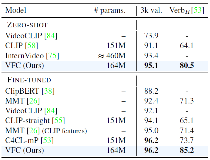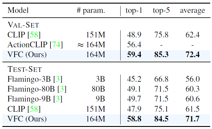 또한 InternVideo는 굉장히 큰 수의 파라미터를 갖는 비디오 도메인의 거대 foundation 모델인데, VFC가 훨씬 적은 파라미터 수로 더욱 높은 성능을 달성하고 있습니다. 그래도 InternVideo가 당시 39개 데이터셋에 대한 벤치마크에서 모두 SOTA를 달성했을 만큼 많은 downstream task들을 다룰 수 있다는 그만의 장점이 있는것도 사실입니다.