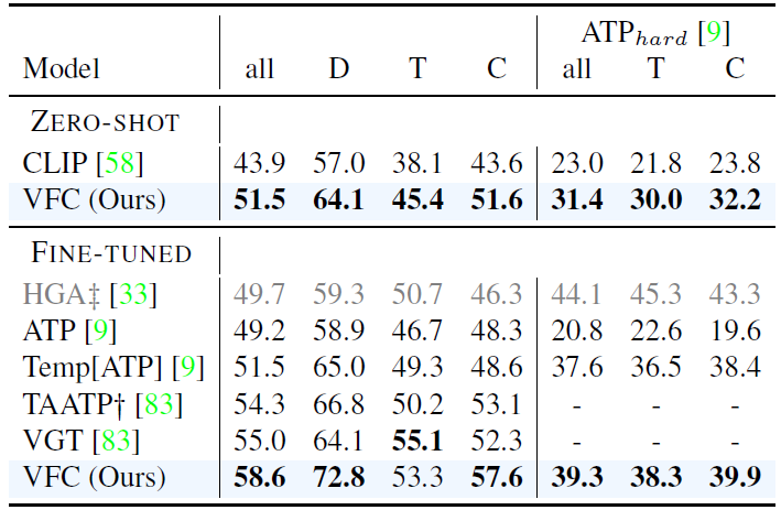우선 표 10을 통해 VFC가 다른 사전학습 방법론들에 비해 Zero-shot이나 Fine-tune 했을 때 더 높은 성능을 보여주고 있는 것을 볼 수 있고, ATP라는 방법론을 제안한 기존 논문에서 manual하게 annotate한 어려운 subset ATP_{hard}에 대한 성능도 타 방법론에 비해 높은 것을 알 수 있습니다.