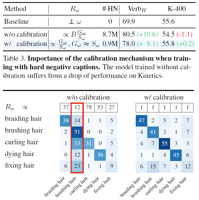 다만 K-400 데이터셋에 대한 분류 성능은 calibration을 진행했을 때 더욱 높은 것을 볼 수 있는데, 이에 대해서는 아래 confusion matrix를 함께 제시하며 설명하고 있습니다. R_{\omega{}}가 높은 경우 negative 개수가 많아 상대적으로 다른 동사들을 많이 밀어내고, 낮은 경우 상대적으로 다른 동사들과 많이 당겨져 있는 상태가 됩니다. Confision matrix에서는 다른 동사들에 비해 ‘brushing hair’가 이와 같은 모습을 보여주어 예측 시 ‘brushing hair’가 우세한 모습을 볼 수 있습니다. 하지만 오른쪽 matrix와 같이 calibration을 통해 R_{\omega{}}를 균형있게 맞춰준다면 contrastive learning을 통한 embedding space가 균형있게 형성된다는 점을 보여줍니다.