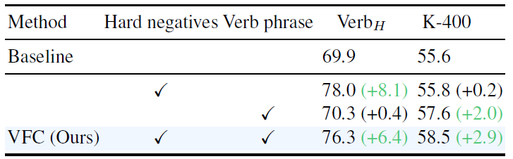 마지막으로 표 6은 저자가 VFC에서 제안하는 모듈들에 대한 ablation 성능입니다. 기본적으로 모두 사용하였을 때 MSR-VTT의 multiple choice task와 K-400의 비디오 분류 성능이 균형있게 올라가는 모습을 볼 수 있습니다. 저자가 방법론 부분에서 이야기했던 점이, verb-phrase loss의 경우 학습에 사용된 동사 구를 주로 사용하는 task에서의 성능 향상을 불러온다고 언급했었는데, K-400이 이에 해당한다고 볼 수 있습니다. 따라서 수행하고자 하는 downstream task에 따라 어떤 사전학습을 수행할 것인지 조정해줄 수 있을 것입니다.