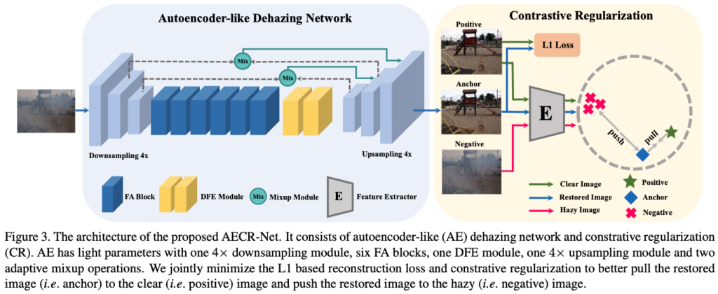 • CR(Contrastive Regularization)을 통해 dehazing 모델의 성능을 더욱 향상시킴