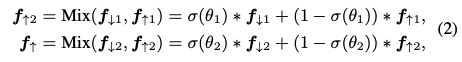 식(2)는 mixup에 대한 출력을 공식화한 식입니다. f_{\uparrow i},f_{\downarrow i}는 각각 i번째 업샘플링/다운샘플링 층의 feature map이고 f_{\uparrow}는 최종 출력 feature map을 나타냅니다. \sigma(\theta_{i})i 번째 다운샘플링과 업샘플링 과정에서 입력으로 받는 feature를 fusion하는 i번째 learnable 파라미터가 됩니다. 해당 값은 sigmoid를 통해 확률값을 반환받아 결정되게 되면서 특정 constant로 사용하는 것보다 좀 더 개선된 효과를 달성할 수 있었다고 합니다.