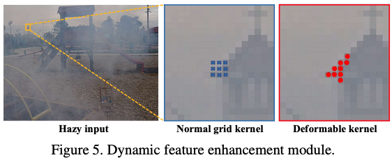 일반적으로 그림(5)의 Normal grid kernel에 나와있는 것과 같이 convolution의 filter 크기를 3×3로 많이들 사용하고 있죠. 저자는 해당 과정에 대해 문제를 지적하게 됩니다. 이는 receptive field를 제한하면서 특징 공간이라는 구조화된 정보를 오히려 활용할 수 없는 문제가 발생하게 되는 원인이라고 합니다. 물론 dilation convolution이 receptive field를 확장하면서 이를 해결할 수는 있겠지만, 결과적으로 dehazing을 수행하면서 아티팩트를 생성하는 결과를 초래하기 때문에 부적절하다고 볼 수 있습니다. 이러한 문제를 해결하기 위해 deformable convolution을 적용하여 그림(5)의 빨간 박스와 같이 커널이 동적이고 상황에 따라 유연하게 대처하기 때문에 기존 convolution 보다 좀 더 중요한 정보를 캐치하기 용이하게 됩니다. 이를 적용한 모듈을 Dynamic Feature Enhancement(DFE)라고 하며 이를 통해 adaptive한 모양으로 receptive field를 확장하면서 모델의 변환 능력을 향상시킴으로써 dehazing을 수행합니다. 그림(3)에 나와있는 노란박스가 DFE 모듈을 의미하며, 이는 FA 모듈과 다르게 2개가 하나의 모듈을 의미합니다. 이는 두개의 deformable convolution 레이어를 사용한다는 의미로 사용한 것으로 보입니다. 이를 통해 모델은 RoI 영역을 계산하기 위해 동적으로 구조화된 정보를 fusion 할 수 있게 됩니다.