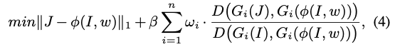 latent feature space 같은 경우 VGG19과 같이 사전학습 모델 G의 중간 feature를 선택하여 사용하게 됩니다. 따라서,언급한 식(1)은 식(3)과 같이 다시 나타낼 수 있습니다. 앞서 언급했던 fidelity term은 결국 restore된 이미지와 GT 이미지 사이의 align을 맞춤으로써 reconstruction loss라고 표현을 하고 있고, \mathcal L_{1} loss를 사용하였다고 합니다. 두 번째 term 같은 경우 조금 변형이 됐죠? G를 통해 동일한 latent feature space에서 I, J, \phi(I, w) 간의 contrastive regularization을 수행하여 restore image \phi(I, w)를 clear image j는 가깝게, hazy image I는 멀게 서로 상반된 형태로 학습하도록 설계합니다. \beta는 이전과 동일하게 reconstruction loss와 CR의 밸런스를 맞추기 위한 하이퍼파라미터가 됩니다.