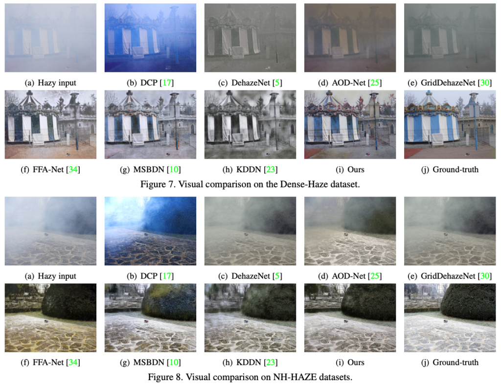 위 그림(7), (8)이 해당 데이터셋입니다. 입력으로 들어가는 hazy 상태가 매우 심각하긴 하네요. 이런 상황에서 자연스러운 결과를 나타내기에는 쉽지는 않아 보입니다. 기존 모델들은 색상 왜곡이 심하거나, 텍스처가 손실되는 그런 현상들을 보여주고 있지만 AECR-Net은 다른 방법론들에 비해 육안으로 대충봐도 엄청 자연스러운 결과를 보여주는 이미지를 생성하는 결과를 보여주고 있습니다.