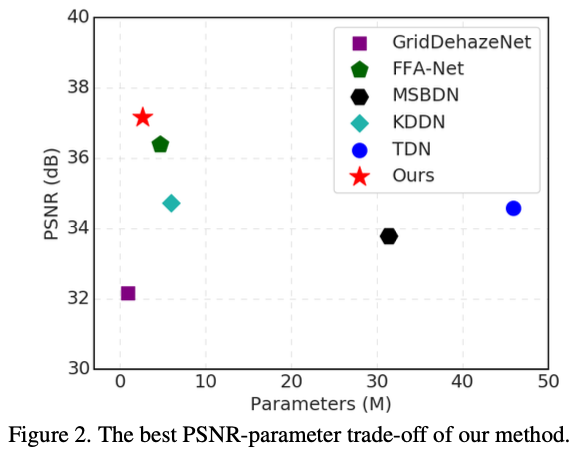 기존 연구들에서는 메모리나, 계산 비용 등을 고려하지 않고 dehazing만 잘하도록 모델의 성능을 향상시키는 것에만 중점을 두어 임베디드 디바이스와 같이 리소스가 제한된 환경에서는 사용을 할 수 없는 상황에 처하게 됩니다. Dehazing 챌린지 대회인 NTIRE 2020에서 1위를 차지한 모델은 4,618만개의 파라미터를 사용한다고 합니다. 그림(2)와 같이 모델 크기와 성능에 대한 trade-off는 당연히 존재합니다. 모델 크기를 그럼 줄이면서 성능을 향상시키기 위한 방법도 고안이 되어야겠네요.