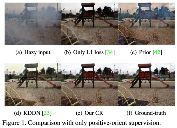 이러한 dehazing 문제를 단순화한 end-to-end 방식의 모델로 CNN 모델들이 많이 제안되었지만 GT(positive, clear image)를 사용하는 reconstruction loss 하나만 사용하게 되면 이미지의 디테일을 효과적으로 표현하는 게 실제로는 어려워 왜곡이 발생하는 경우가 그림(1)(b)와 같이 발생하게 됩니다.