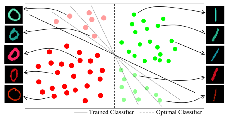 (기존 해결책) 앞선 예시를 포함하여 인종/성별 등 민감한 주제에 대한 잠재된 편향이 해결은 딥러닝 분야에서 집중하는 문제 중 하나입니다. 첫번째 해결 시도로는 편향 특징에 대한 라벨을 직접적으로 이용하는 것이었습니다. 예를 들어 참고그림(1)처럼 데이터의 실제 라벨인 숫자 정보와 편향 라벨인 색 정보를 모두 활용해, 색 편향에 관계없이 숫자 정보를 판별하는 모델을 설계하는 연구[1]가 있습니다. 그러나 이러한 접근 방식은 편향 라벨을 직접적으로 활용하여 어노테이션 비용이 증가할 뿐 만 아니라 사전에 감지하지 못한 편향까지는 예방할 수 없다는 한계가 있습니다. 이를 해결하기 위해 편향 라벨의 필요성을 줄인 접근법이 제안되었습니다. 해당 방법론들은 학습에 악영향을 미치는 편향 데이터가 대체로 학습하기 쉽다는 특징을 지닌다는 인사이트를 기반으로 제안됩니다. 지난 리뷰[2]와 마찬가지로 해당 방법론들은 학습하기 쉬운 특징을 지닌 데이터의 학습 가중치를 낮추어 편향을 해결합니다. 본 논문도 이러한 접근법에 포함하는 방법론 중 하나입니다.
