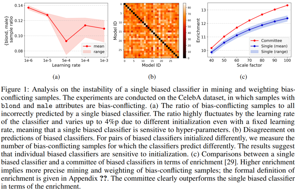 먼저 Figure 1(a)는 Learning rate에 따른 Biased classifer가 틀린 예측의 정보입니다. 매개변수인 learning rate에 따라 분류기가 감지하고 학습하는 Bias의 정도가 크게 변화한다는 것을 보이는 실험이며, 단일 Biased Model을 통해 편향 특징을 검출하는 것의 위험성을 보이는 실험입니다. Figure 1(b)도 이와 동일한 실험으로 30개의 초기화만을 달리한 모델간의 예측 유사성을 나타낸 것입니다. 예측 유사성이 낮은것을 통해 Biased model로 학습한 특징이 일관적이지 않고 초기화와 같은 랜덤성에 의존도가 높음을 의미합니다. 마지막으로 Figure 1(c)는 단일 biased model과 제안하는 방법론의 committee biased model이 *bias-conflicting samples에 집중하는 정도를 비교한 것으로, 제안하는 방법이 일관성 있고 더 강하게 bias-conflicting samples의 중요도를 높게 보고 있음을 확인할 수 있습니다.