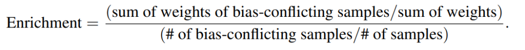 수식(2)에서 m은 committee의 크기이고 α는 매개변수 입니다. 수식(2)는 m개의 보조 분류기 예측의 일관성을 기반으로 샘플의 중요도를 산출하며, 보조 분류기의 예측이 모두 옳을 경우 가중치는 1에 가까워지고, 예측이 틀리는 보조 분류기가 많아질 수록 해당 샘플에 학습 가중치는 증가합니다. 즉, 보조 분류기 예측이 일관되지 않을 수록 “학습 하기 쉬운 연관관계를 포함하지 않은” bias-conflicting samples이라 판단하여 학습 가중치를 높이는 것 입니다.