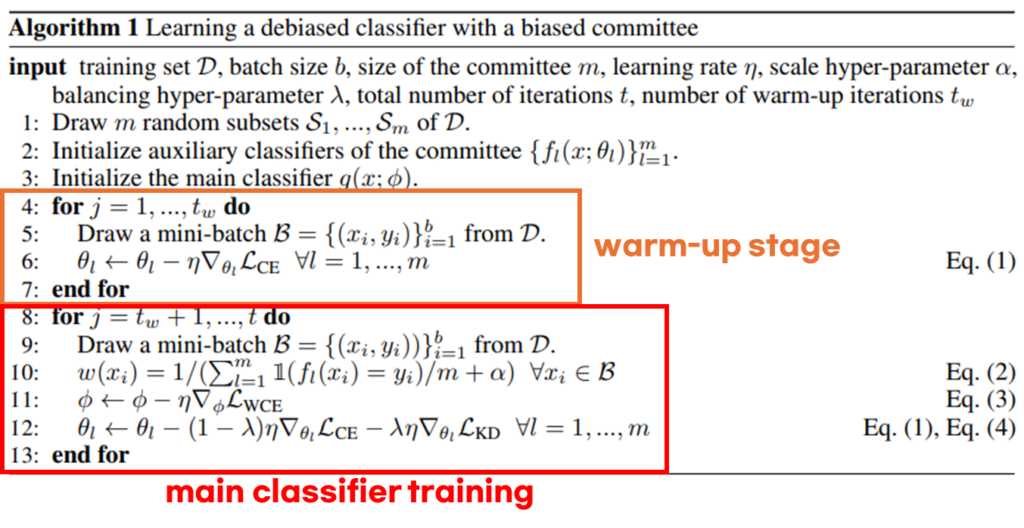 - Main classifer(g)의 학습: 마지막으로 commitee를 활용하여 Debiased Model인 g를 학습합니다.