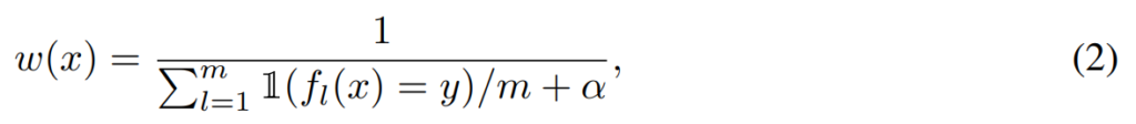 먼저 전체 학습 데이터(D)를 활용해 m개의 subsets(S1, … Sm) 을 생성합니다. 다음으로 m개의 subsets을 이용해 학습할 보조 분류기(f1, … fm)와 메인 분류기(g)를 초기화 합니다. 이후 학습 과정에서는 bias를 해결할 bias-conflicting samples를 찾아 학습에 높은 가중치를 부여하기 위해 사용될 committee를 구성을 위해, 앞서 선별한 subsets을 활용하여 보조 분류기를 학습하는 warm-up stage가 우선됩니다. 학습 데이터의 다양한 편향적 특성이 반영된 보조 분류기를 활용해 전체 데이터셋에 대한 가중치를 생성하는 수식은 아래의 수식(2)와 같습니다.