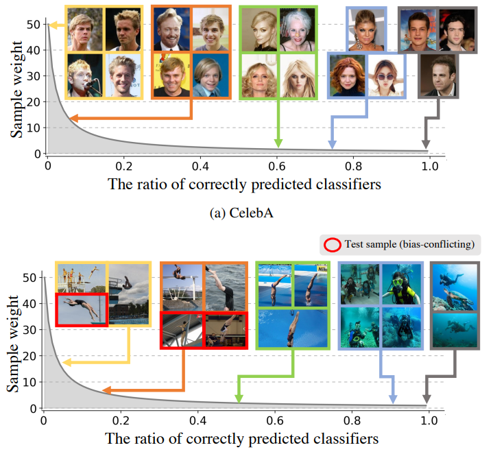 요약하면, committee를 구성해 각 훈련 sample에 얼마나 bias한 특성을 포함하고 있는지 가중치를 적용해 학습한 방법론으로 이해했습니다.