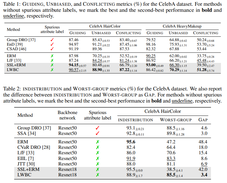 - Worst-group: 데이테셋의 bias를 활용해 구성된 그룹의 정확도 중 가장 낮은 정확도