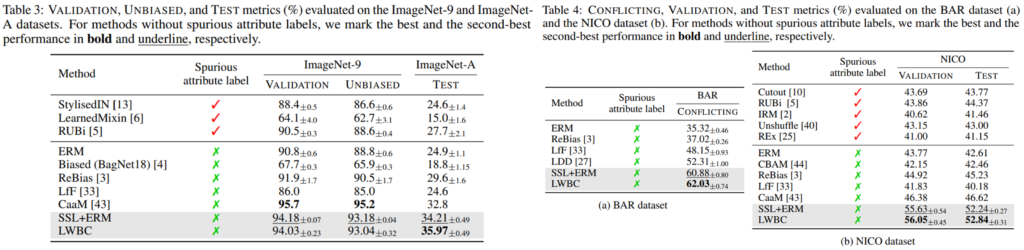 또한 real world data인 ImageNet-9/A(Table3), NICO와 BAR(Table4)에서도 비교 방법론 대비 높은 정확도를 보이며 우수성을 검증했습니다.