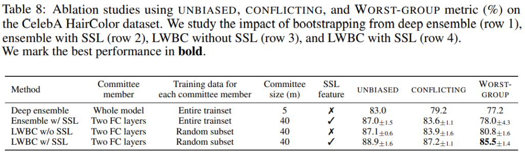 논문은 Ablation studies를 통해 제안하는 각 모듈(Commitee/KD)이 모두 debiased에 긍정적 효과를 미침을 증명하였습니다. 해당 테이블의 Worst-group을 리포팅한 이유는 방법론에 따른 극적인 성능 개선을 보이기 위한것으로, supplement에 다른 지표의 성능역시 리포팅(Table 8 참조)하여 제안 모듈들의 우수성을 확실하게 보였습니다.