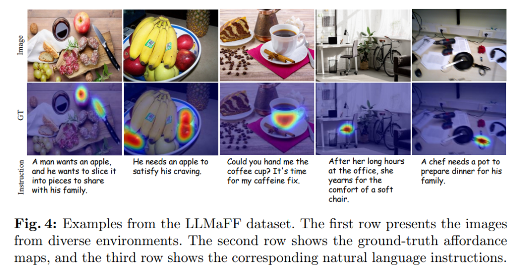 사물은 affordance에 따라 크게 8가지 유형으로 분류하였으며(handheld objects, operable objects, sitable objects, containable objects, supportive objects, decorative objects, and informative objects), Fig. 3은 8가지 유형에 해당하는 객체의 수와 데이터 셋에서 사람의 지시어 길이에 대한 그래프로, 지시문의 길이가 다양하다는 것을 확인하실 수 있습니다. 아래의 Fig. 4는 LLMaFF 데이터 셋의 예시로, 다중 객체들로 이루어진 이미지에 대하여 지시문과 그에 해당하는 객체들의 영역이 표현된 것을 확인하실 수 있습니다.(AGD20K 예시와 비교해보시면 조금 더 객체의 영역이 정밀하게 활성화되어있는 것을 확인하실 수 있는 데, 이는 여러 점을 찍고 반복해서 검토하는 방식을 적용하므로써 보다 정밀한 affordance map을 만들 수 있었던 것으로 보입니다.)