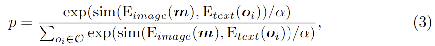 LLM으로 구한 affordance에 대한 지식을 시각 정보와 통합하기 위해 저자들은 SAM과 CLIP을 활용합니다. SAM과 CLIP은 zero-shot 기반의 다양한 테스크에서 안정적인 성능을 보여주어 광범위하게 활용되고 있습니다. 저자들은 먼저 SAM에 이미지를 입력하여 N개의 segment mask를 생성합니다. 이러한 마스크는 의미론적 정보가 부족하며, 객체의 관련 여부를 고려하지 못합니다. 따라서 지시에 대응되는 객체 mask만을 얻기 위해 CLIP을 적용하여 마스크의 형태와 앞서 LLM으로 구한 객체 카테고리 사이의 유사성을 계산합니다. 구체적으로는 segmentation mask에 해당하는 영역에 해당하는 시각 정보만을 원본 이미지에서 추출하여 cropped regions \mathbf{m}을 CLIP image Encoder E_{image}로 인코딩하고, 객체의 카테고리 정보 \mathbf{o}는 CLIP의 text encoder E_{text}로 인코딩 한 뒤, 해당 마스크가 i번째 객체 카테고리로 분류될 확률은 아래의 식(3)을 통해 구합니다.
