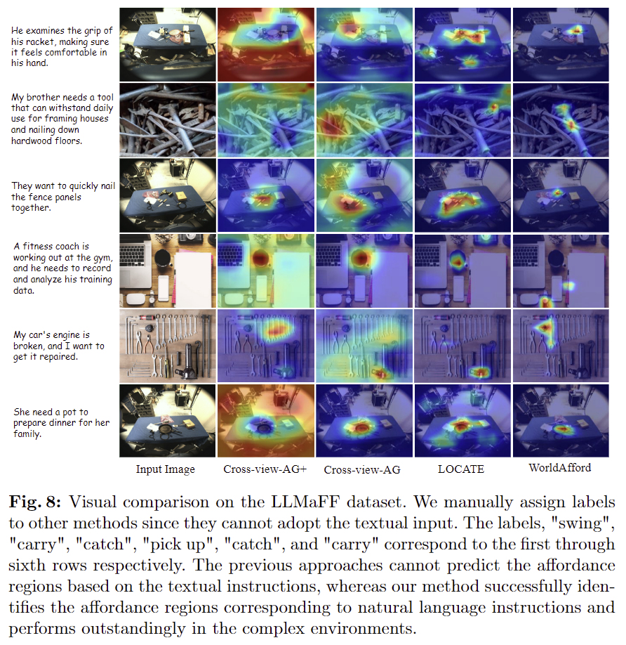 - 아래의 Fig. 8은 정성적 결과로 Cross-view-AG+는 영상 내의 여러 객체에 대한 affordance 인식이 잘 이루어지지 않고 있음을 확인할 수 있으며, LOCATE의 경우 대체로 일부 객체에 집중하고 있으나 여러 객체를 구분하여 인식하지 못하며(3행의 경우 뭉터기로 예측되어있음) 이러한 기존 방법론과 비교했을 때 WorldAfford가 자연어 지시문에 적절한 영역에 국소적으로 예측됨을 확인할 수 있습니다.