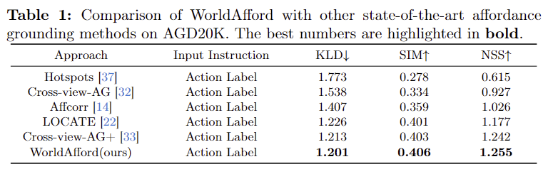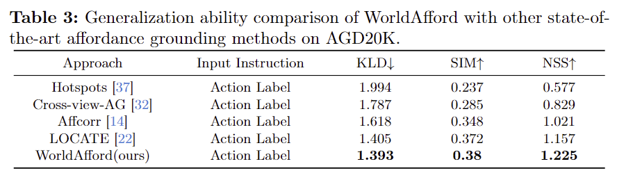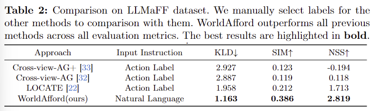 - 기존 방법론과 비교했을 때 WorldAfford의 성능이 가장 뛰어남을 확인할 수 있습니다.